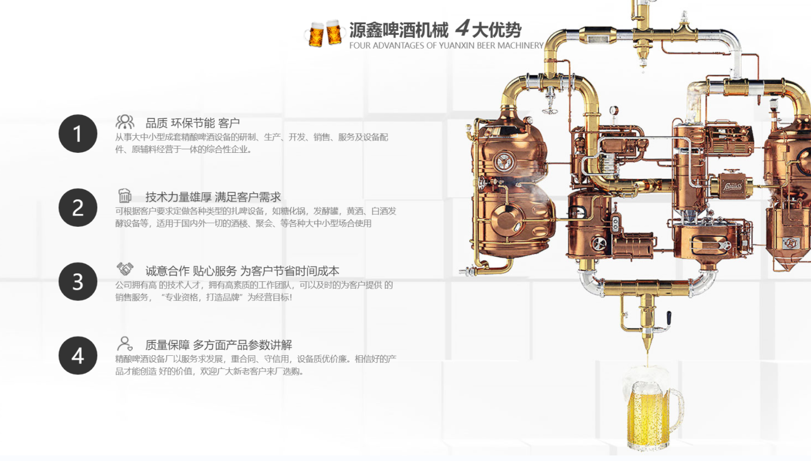 南陽市源鑫啤酒機(jī)械設(shè)備有限公司位于歷史文化名城一-南陽,從事大中小型成套啤酒、白酒自釀設(shè)備的研制、生產(chǎn)、開發(fā)、銷售、服務(wù)及設(shè)備配件、原輔料經(jīng)營(yíng)于一體的綜合性企業(yè)。公司可根據(jù)客戶要求定做各種類型的扎啤設(shè)備,如糖化鍋,發(fā)酵罐,黃酒、白酒發(fā)酵設(shè)備等,適用于國(guó)內(nèi)外一切的酒樓、餐廳、家庭.聚會(huì)、酒吧等各種大、中、小型場(chǎng)合使用。公司擁有技術(shù)人才,擁有高素質(zhì)的工作團(tuán)隊(duì),可以及時(shí)的為客戶提供**的銷售服務(wù)。公司以“專業(yè)資格,打造品牌”為經(jīng)營(yíng)目標(biāo),“卓越質(zhì)量,信賴價(jià)格”為經(jīng)營(yíng)宗旨,以質(zhì)量求生存,以服務(wù)求發(fā)展,重合同、守信用,設(shè)備質(zhì)優(yōu)價(jià)廉。相信好的產(chǎn)品才能創(chuàng)造 好的價(jià)值,歡迎廣大新老客戶來廠選購(gòu)。...